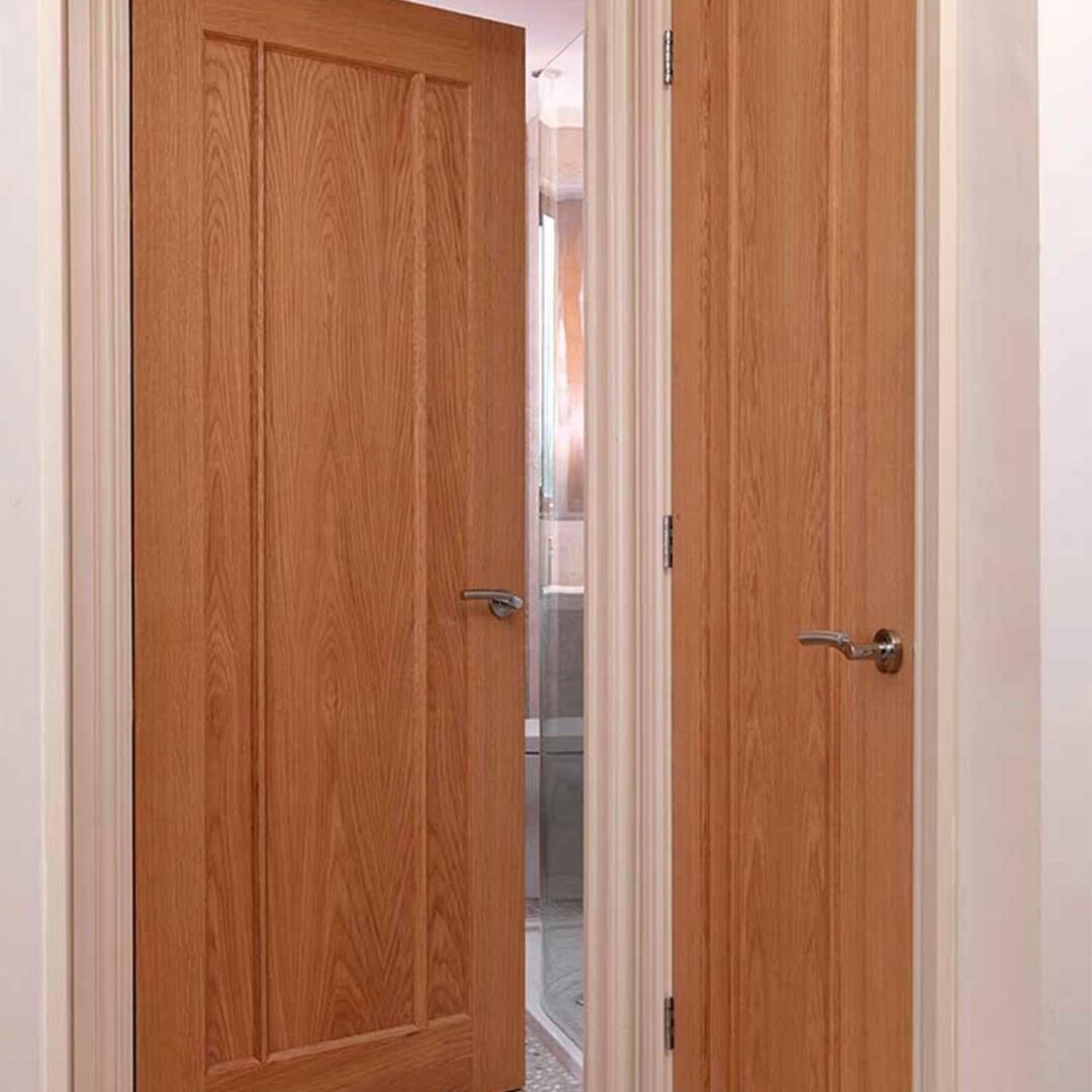 Unfinished Oak Veneer with Solid Core Construction. Classic Style with Recessed Flat Centre Panel and Decorative Muntings.